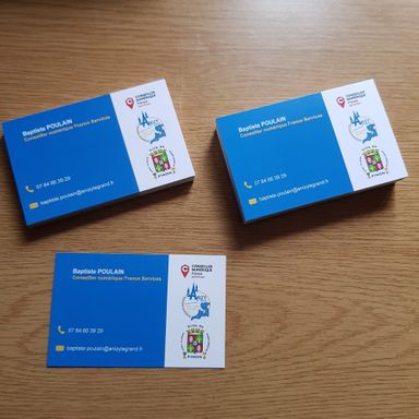 Cartes de visite pour le conseiller numérique France Services de la mairie d'Anizy-le-Grand (Aisne). 85 x 55mm. 350gr/m2. Recto seul.